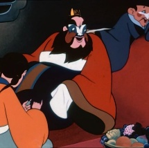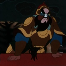 《驕傲的將軍》的角色造型設(shè)計采用寫實和抽象兩種風(fēng)格相結(jié)合的方式,從中國傳統(tǒng)京劇臉譜中充分汲取營養(yǎng),充分地利用各種優(yōu)美的譜式和色彩對比強烈的色塊塑造出富有特色的角色形象。為了把將軍健壯、魯莽的性格特征表現(xiàn)出來,將軍的臉部造型以京劇中象征大人物的“大花臉”譜式為基礎(chǔ)并被夸張成上窄下寬的梯形,大花臉的譜式中典型的大面積的白色色塊,經(jīng)過鼻子貫穿整個額頭和下巴形成類似“蝙蝠”的形狀,眼睛四周涂以讓人望而生畏的青灰色,將剩余的兩頰位置涂以胭脂紅,這紅白兩色之間又被表現(xiàn)寬大眉眼和滿臉絡(luò)腮胡子而形成的大面積的使用暗示剛烈、粗率、魯莽的黑色塊面分開。[1][1]