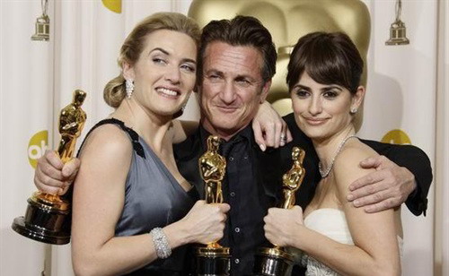 肖恩·潘(中)稱帝后與影后凱特·溫絲萊特(左)、最佳女配角佩內(nèi)洛普·克魯茲(右)合影
