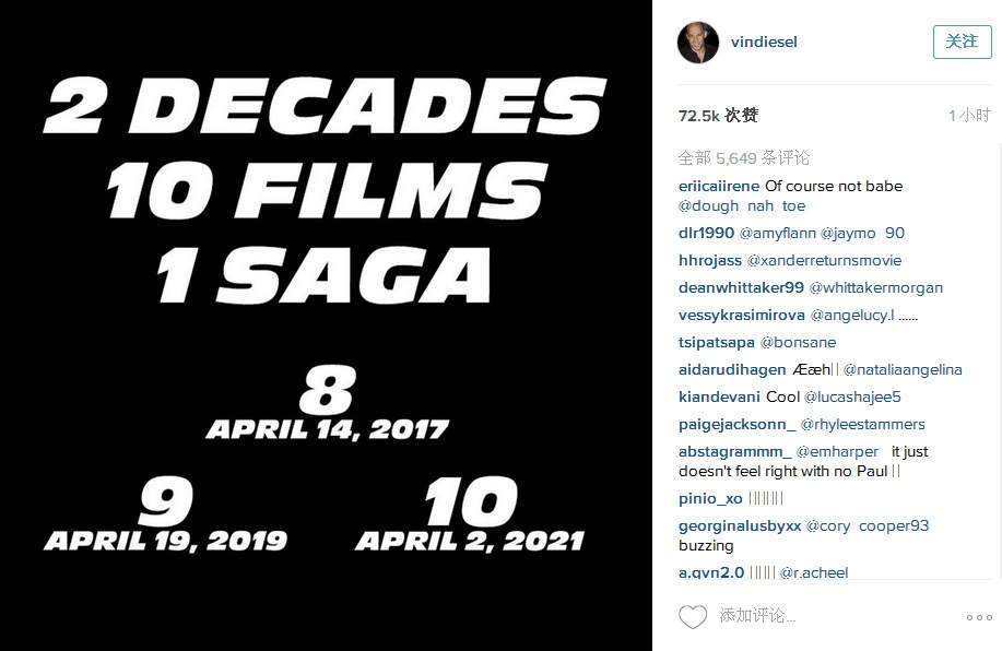 1905電影網(wǎng)訊 近日,《速度與激情》系列男主范·迪塞爾在個(gè)人社交賬號(hào)上曝光了系列第八部、第九部和第十部的北美上映日期,三部影片將分別在2017年4月14日、2019年4月19日和2021年4月2日上映。片方環(huán)球影業(yè)也證實(shí)了這則消息。