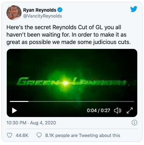 “這是雷諾茲剪輯版(Reynolds Cut)的秘密《綠燈俠》,你們對此并沒有等待已久,”小賤賤在推文中寫到?!盀榱俗尡酒兊帽M量偉大,我們做了一些明智的剪輯工作?!边@段小視頻從《死侍2》的片尾彩蛋中,死侍用槍打爆了正在閱讀《綠燈俠》劇本的小賤賤腦袋那一幕開始,然后囊括了基本上《綠燈俠》所有他認(rèn)為重要的劇情點(diǎn)。視頻中,他甚至還把湯姆·克魯斯的臉作為綠燈俠,p了進(jìn)去。
