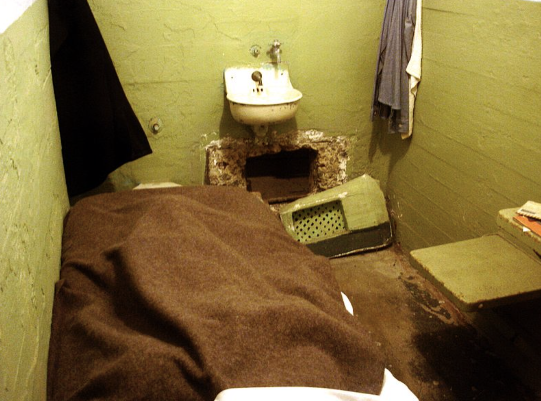 有且僅有一張床、一塊毛毯、一個馬桶、一支鉛筆、一把湯匙、一塊剃須刀的刀片、兩扇窗和一個固定在墻上的石頭架子。